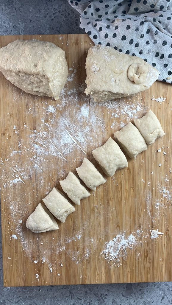 Deixe descansar, coberto, por cerca de 30 minutos.Neste ponto, a preparação é semelhante à dos nhoques: corte a massa em 8 partes e faça pequenos rolos de aproximadamente 2cm de largura cada.