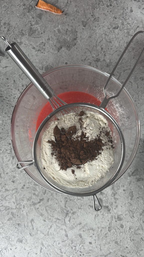 Peneire na tigela com os ingredientes úmidos a farinha, o cacau e o fermento em pó para bolos.