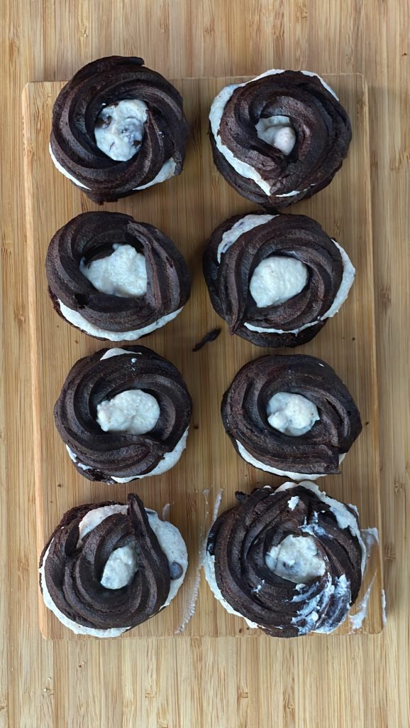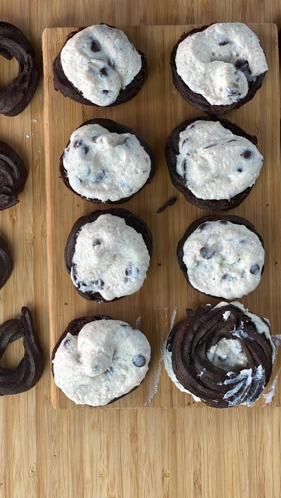 Adicione as gotas de chocolate e misture novamente para distribuí-las uniformemente.Corte as zeppole de cacau ao meio e recheie com o creme de ricota.