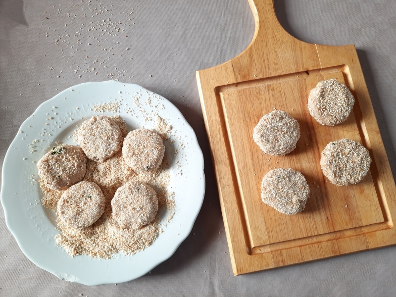 Amasse-as levemente com a palma da mão e passe na farinha de rosca.