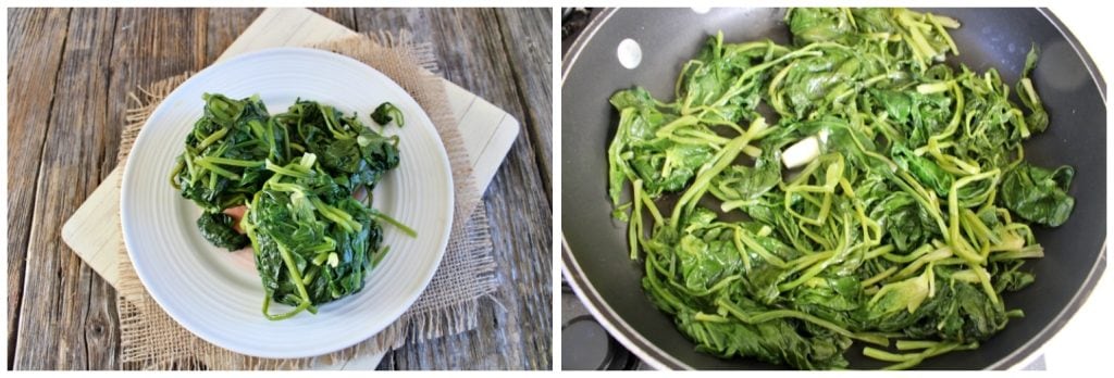• Enquanto isso, pegue os espinafres já cozidos, esprema para eliminar o excesso de água e coloque na frigideira com um fio de azeite de oliva e um dente de alho por alguns minutos, para dar sabor.