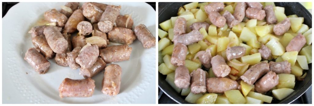 • Enquanto isso, descasque as batatas, lave e corte em pedaços, depois coloque-as na frigideira onde cozinhou a linguiça, ajuste o sal, cubra com uma tampa e cozinhe em fogo médio-baixo por cerca de 25 – 30 minutos (depende do tamanho das batatas). Misture de vez em quando, tendo cuidado para não queimar.