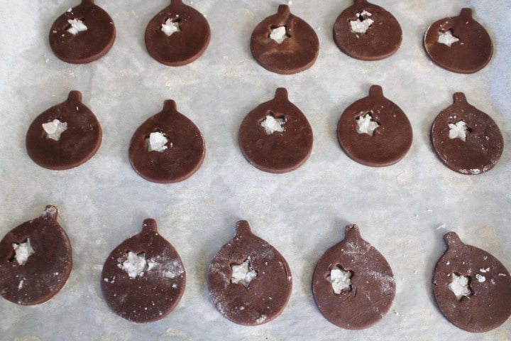 • Em seguida, corte os biscoitos com os moldes que preferir e coloque-os em bandejas forradas com papel manteiga; com um molde menor em forma de estrela, fiz um furo à esquerda.