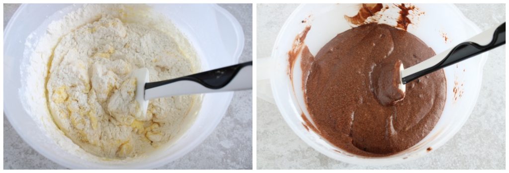 • Dissolva o cacau em pó no leite pré-aquecido. Bata o açúcar e a manteiga com a batedeira elétrica até obter um creme claro. Adicione os ovos, um de cada vez, batendo em velocidade média.