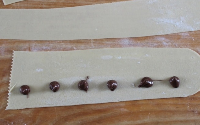 • Com a ajuda de um saco de confeitar (ou de uma colher), coloque na parte inferior da folha uma série de colheres de Nutella, bem espaçadas umas das outras. O tamanho depende do quão grandes você quer fazer suas chiacchiere.