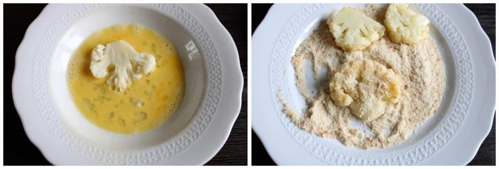 Em seguida, bata os ovos em um prato, adicione as fatias de couve-flor e deixe descansar. Enquanto isso, em outro prato, coloque a farinha de rosca. Pegue uma fatia de cada vez e passe-a na farinha de rosca, cobrindo bem.
