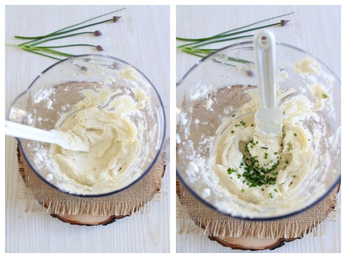Primeiro, bata bem as alcachofras junto com o queijo cremoso (eu usei Philadelphia) com um mixer de imersão até obter um creme homogêneo sem pedaços.