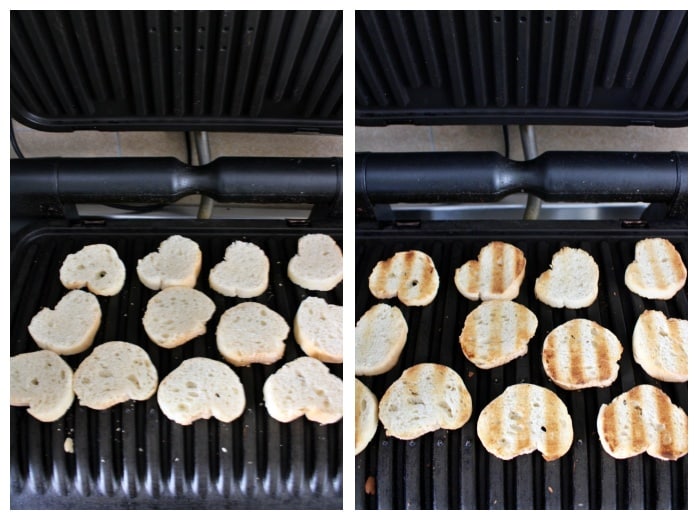 Neste ponto, corte em fatias (com cerca de 1 cm de espessura) um pão tipo baguete ou integral (eu usei um tipo de pão chamado rubatà, com diâmetro de 4 cm), coloque as fatias em um grill e deixe grelhar por alguns minutos.
