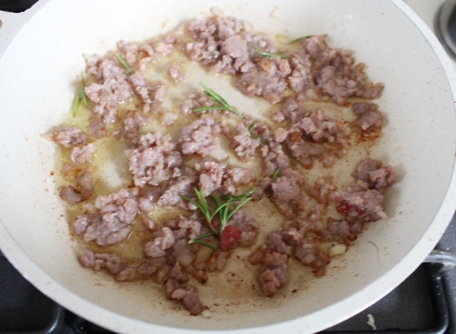 Primeiro, retire a pele da linguiça e desfaça-a, esmagando com um garfo; coloque-a em uma frigideira com 3 colheres de azeite de oliva extra virgem e 1/2 cebola picada e alguns ramos de alecrim, e refogue por alguns minutos.