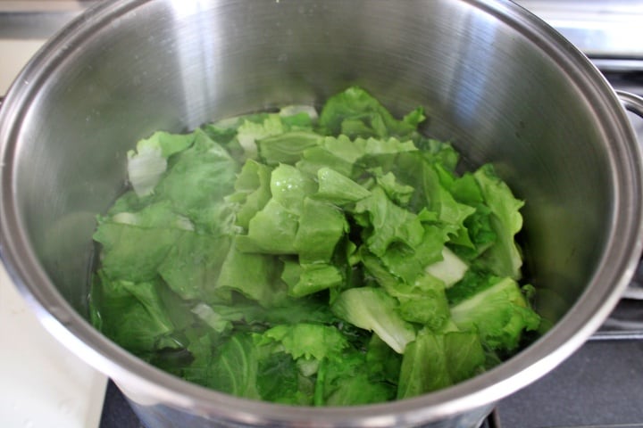 Coloque a ferver água em uma panela e, uma vez fervendo, corte a escarola em 4-5 partes e coloque-a para cozinhar na panela por cerca de 10 – 12 minutos, depois escorra e deixe esfriar um pouco.