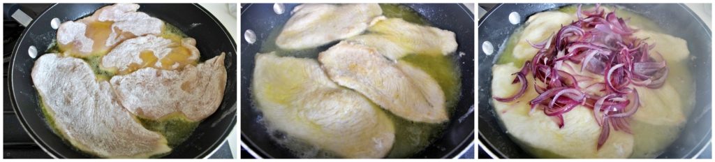 Enquanto isso, enfarinhe os filés de frango e, quando as cebolas estiverem bem macias, junte-os na frigideira, salpique levemente, adicione também o vinho branco e deixe evaporar. Após alguns minutos, vire os filés de frango e termine de cozinhar até que fiquem bem dourados.