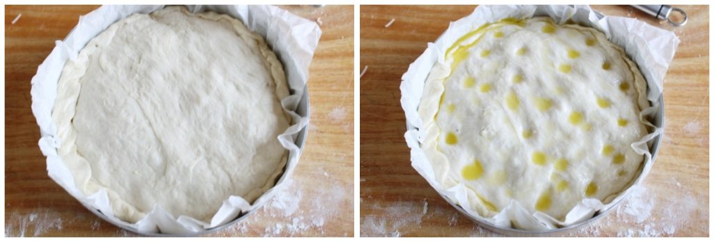 Uma vez levedada a massa, forre uma assadeira ou uma assadeira de cerca de 28-30 cm de diâmetro com papel manteiga untado com azeite, então divida a massa em 2 partes e abra uma das 2 partes diretamente na assadeira, espalhando-a com as mãos.