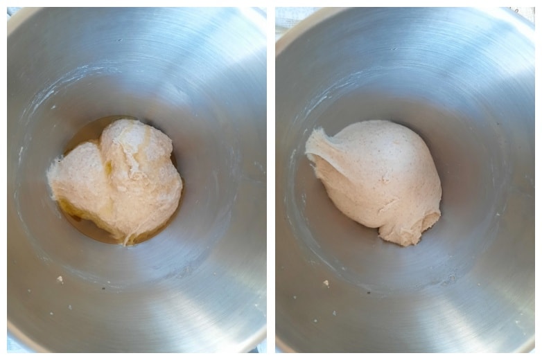Enquanto amassa, adicione o azeite de oliva extravirgem e o sal: deixe o azeite ser bem absorvido.