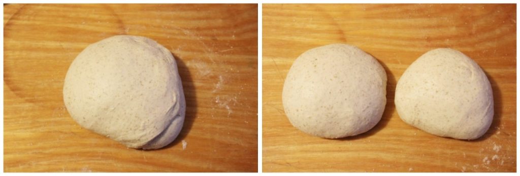 Neste ponto, divida a massa em 4 partes (2 partes devem ser ligeiramente menores – cerca de 20 g a menos em relação às outras 2, que serão a base da focaccia), se você quiser criar 2 focaccias.