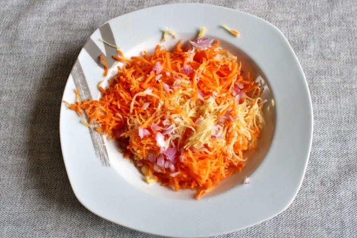 Primeiro, descasque a batata e a cenoura, lave-as e rale-as com um ralador de furos médios ou com um processador elétrico de legumes: esprema-as bem para eliminar o excesso de água.