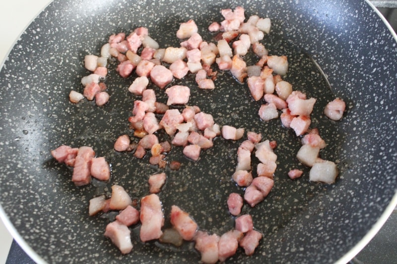 Primeiro, em uma frigideira grande, aqueça 3 colheres de azeite de oliva extra virgem, adicione o bacon em cubos e deixe dourar levemente. Se gostar, pode adicionar meia cebola cortada finamente.