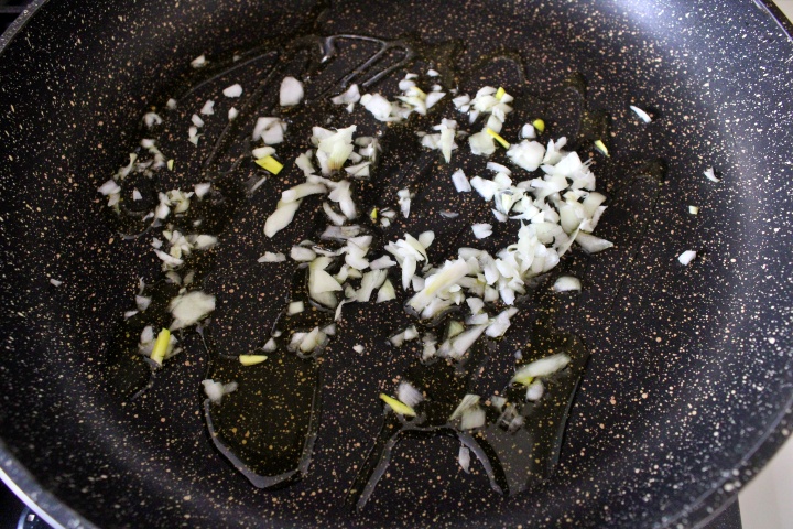 Enquanto isso, em uma frigideira grande aqueça 4 colheres de azeite extra virgem, adicione a cebola picada finamente com um picador manual (prático e rapidinho) e deixe a cebola dourar.