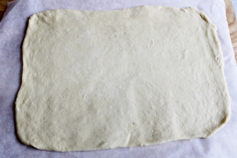 Após o tempo de fermentação, vire a massa sobre uma superfície de trabalho levemente enfarinhada e estenda até formar um retângulo. Divida em 8 porções mais ou menos iguais. Cada porção deve ter cerca de 8-9 cm de comprimento e 5-6 cm de largura.