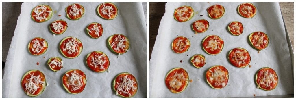 A preparação é realmente simples: cortei as abobrinhas em fatias finas e as assei por alguns minutos, depois as cobri com molho de tomate pronto e com muçarela cortada finamente, mais uma passada no forno e voilà.