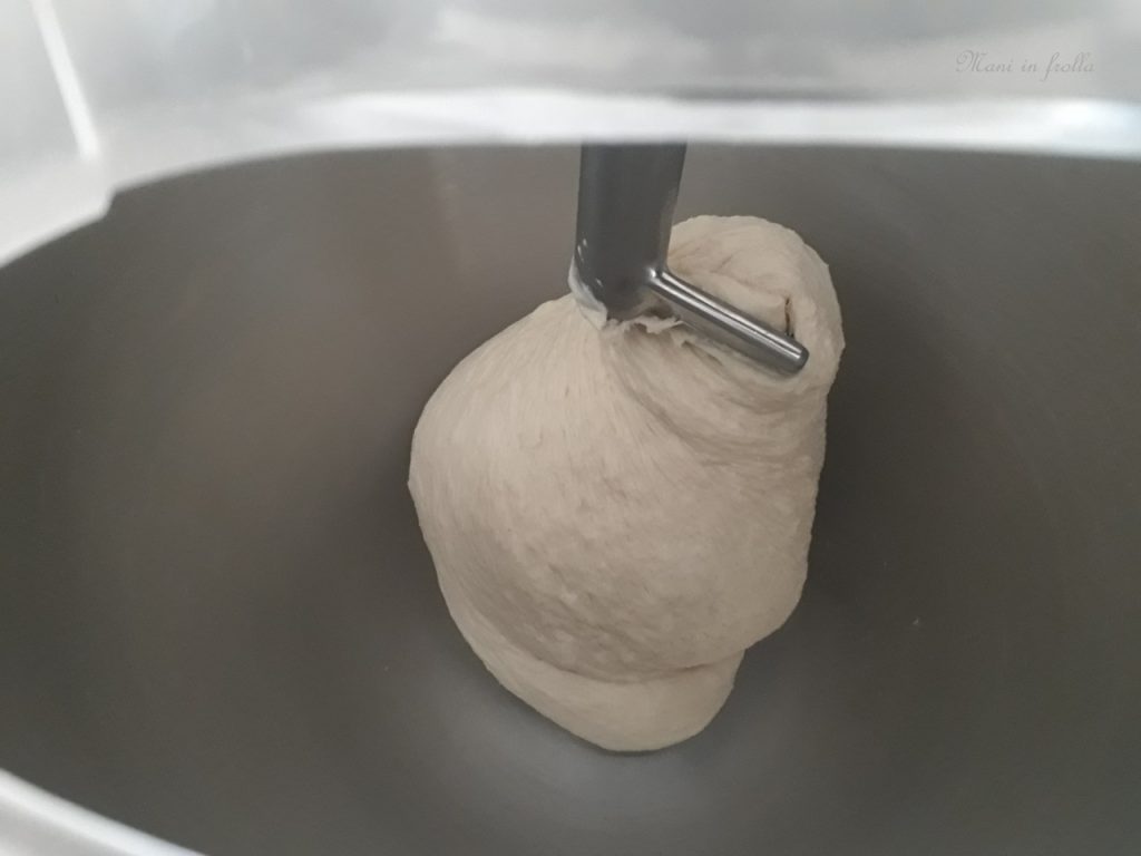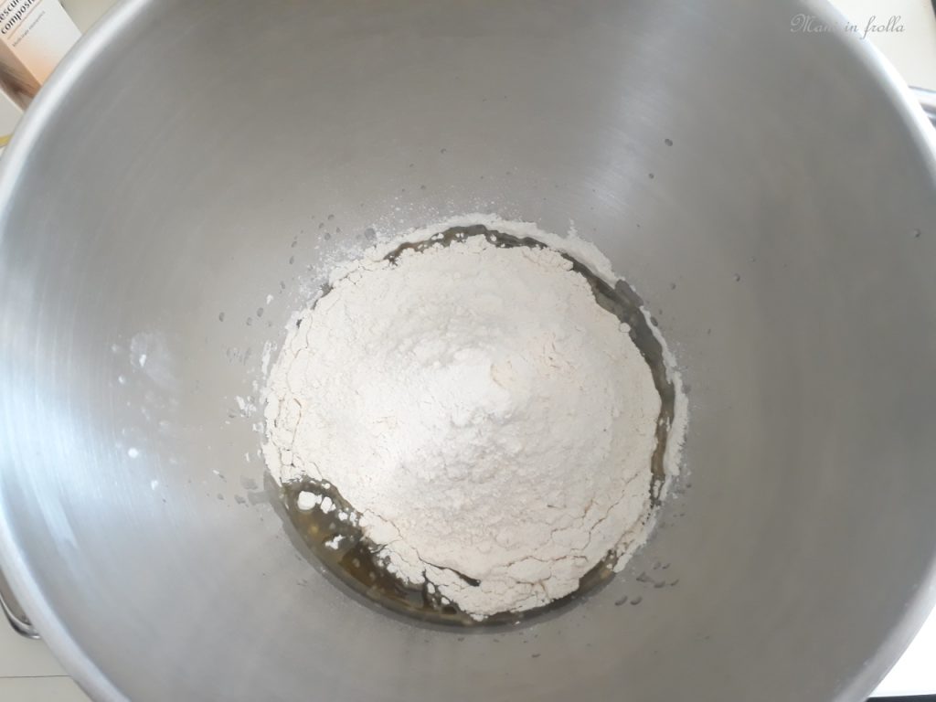 • Para começar, prepare a massa. Despeje a água na batedeira, adicione o sal e o azeite. Acrescente a farinha e comece a misturar. Usei 300 g de farinha de Tipo 2 Buratto do Molino Marino e 200 g de farinha tipo 0. Em seguida, adicione também o fermento e continue a misturar por cerca de 8 – 10 minutos.