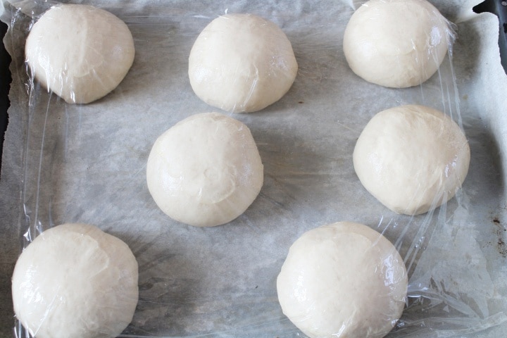 • Faça algumas dobras, então enrole bem a massa para formar bolinhas que você vai deixar descansar cobertas, no forno desligado com a luz acesa, por cerca de 1 hora. Aqui estão elas após a fermentação.