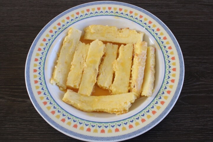Em um prato fundo, bata um ovo (se for grande, caso contrário, 2 pequenos: depende da quantidade de gateau que você tem) e adicione as fatias de gateau e deixe descansar.
