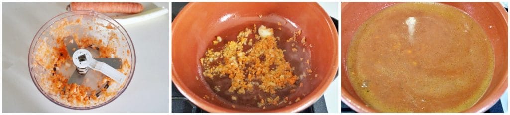 • Enquanto isso, pique com um processador a cebola, a cenoura e o aipo e adicione à panela com o alho; deixe refogar por alguns minutos, depois elimine o alho e adicione 1 concha de água quente salgada (ou caldo de legumes fervente) e cozinhe por cerca de 10 minutos.