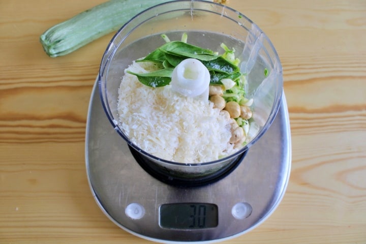 Neste ponto, coloque as abobrinhas espremidas no copo do liquidificador junto com as avelãs, o dente de alho sem o germe, as folhas de manjericão, o parmesão ralado, 2 pitadas de sal e o azeite de oliva extra virgem.