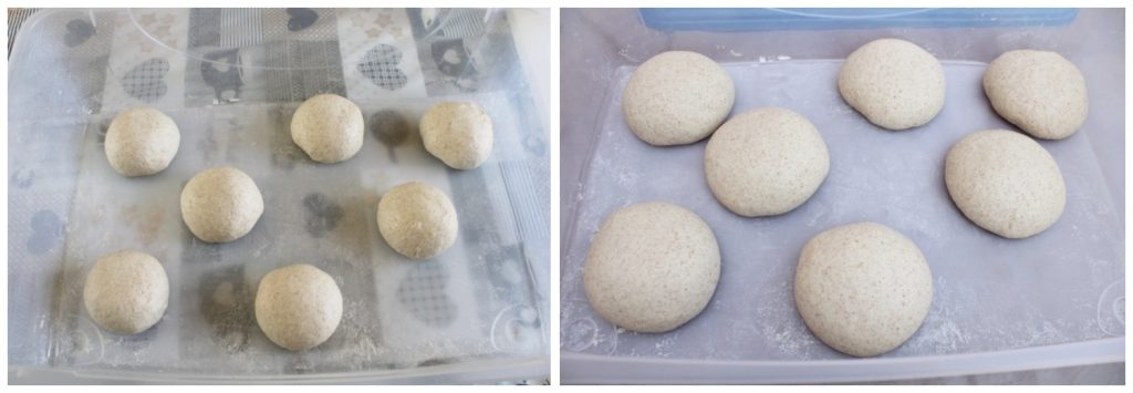 Depois, divida-a em 6 bolas de cerca de 272 g (ou 7 bolas de 233 g para pizzas um pouco menores), formando bolinhas e deixe-as descansar, espaçadas, em um recipiente grande o suficiente, por cerca de 1 hora: elas devem dobrar de volume.