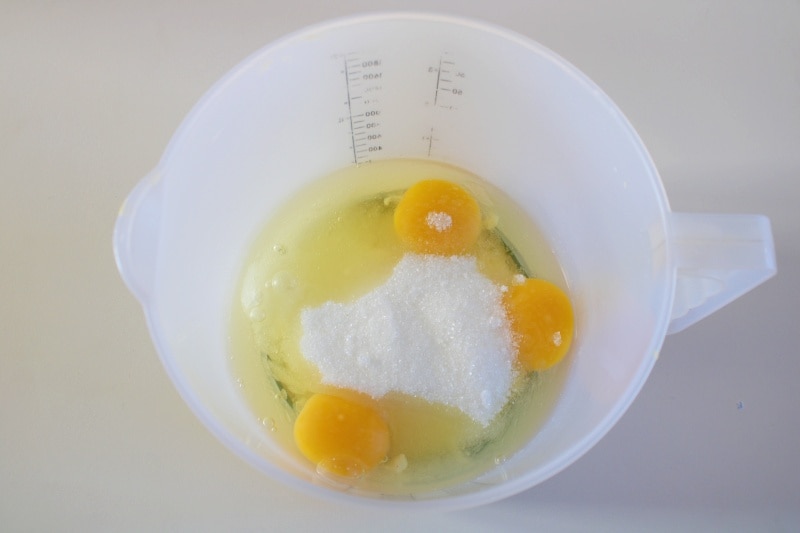 Com a batedeira elétrica, bata os ovos inteiros com o açúcar e uma pitada de sal,