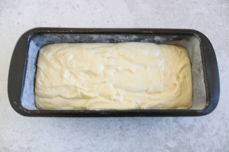 Unte e enfarinhe uma forma de plumcake de 25 cm e despeje delicadamente a massa para não desmontá-la.