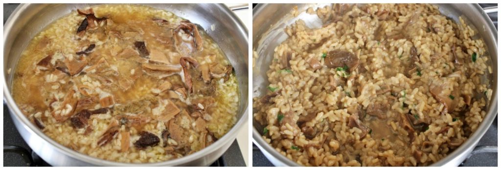 Adicione os cogumelos cortados em pedaços e continue o cozimento: ao todo levará cerca de 20 minutos. No final do cozimento, ajuste o sal se necessário, e misture com a manteiga. Finalmente, adicione a salsinha picada e o parmesão ralado, então, sirva.