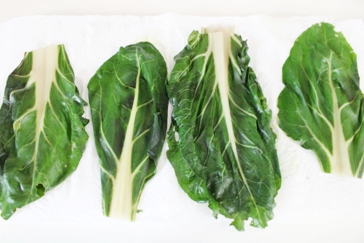 • Primeiro, limpe as acelgas (ou bietole): remova a parte branca, (mas não jogue fora, você vai precisar para fazer essas deliciosas Bistecas vegetarianas), e lave-as sob água corrente. Depois, coloque para ferver água levemente salgada em uma panela e cozinhe-as inteiras por cerca de 3 – 4 minutos, então coloque-as para secar em uma tábua coberta com papel toalha.