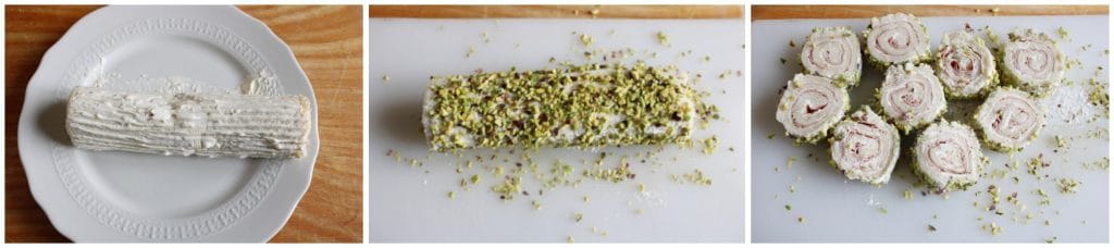 • Antes de servir, cubra a superfície dos rolinhos com mais queijo cremoso, faça-os rolar no granulado de pistache, corte em fatias e sirva.