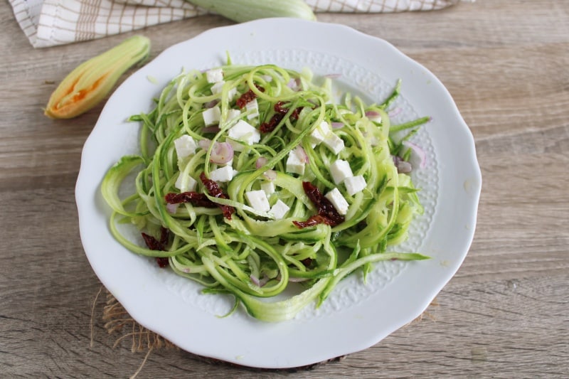 Coloque as abobrinhas cortadas em julienne bem secas em uma tigela grande, junto com a cebola de Tropea cortada em fatias bem finas, os tomates secos escorridos e cortados em tiras. Corte a Feta em cubos (ou se preferir, esmigalhe) e adicione à salada. Adicione o azeite extravirgem de oliva, o suco de limão (ou vinagre), o alho (se gostar) finamente picado, o sal e a pimenta.