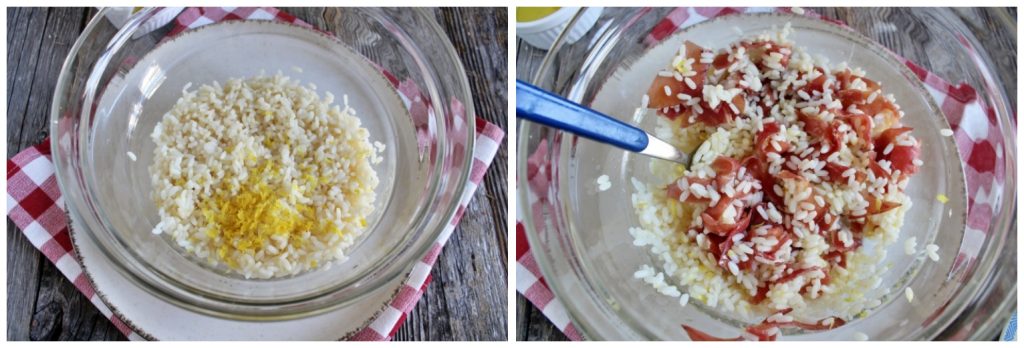 Uma vez que o arroz esteja pronto, finalize o prato. Então, coloque o arroz em um prato de servir, tempere com as raspas de limão e misture bem. Adicione a bresaola cortada e a emulsão com azeite e limão; mexa.