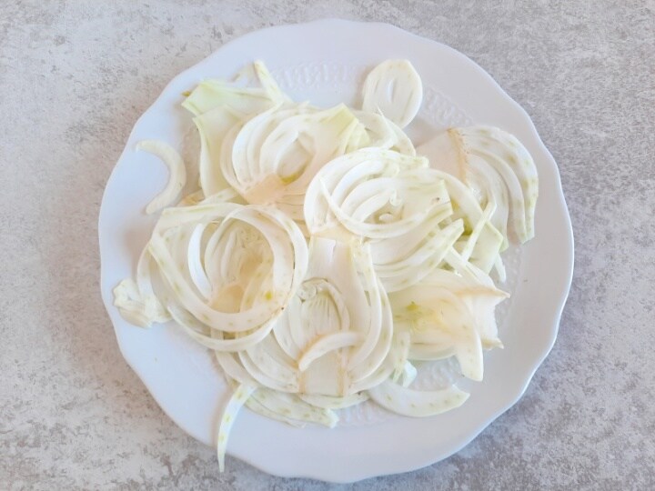Lave o funcho em água corrente e corte os talos até a base. Divida o funcho ao meio e remova as folhas externas mais duras. Com uma faca afiada (ou com uma mandolina), corte-o em fatias finas no sentido do comprimento.