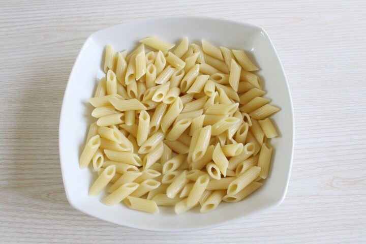 Primeiro, coloque no fogo uma panela com bastante água e leve para ferver. Quando a água estiver fervendo, adicione o penne (ou o formato de massa curta que preferir) e cozinhe al dente por pelo menos 9 – 10 minutos (dependendo das instruções da embalagem).