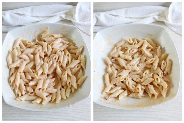 Adicione o creme de Philadelphia à massa, misture bem, depois adicione também o atum escorrido e, por último, os tomatinhos e as azeitonas. Termine com folhas de manjericão fresco e sirva imediatamente ou mantenha na geladeira até o consumo.