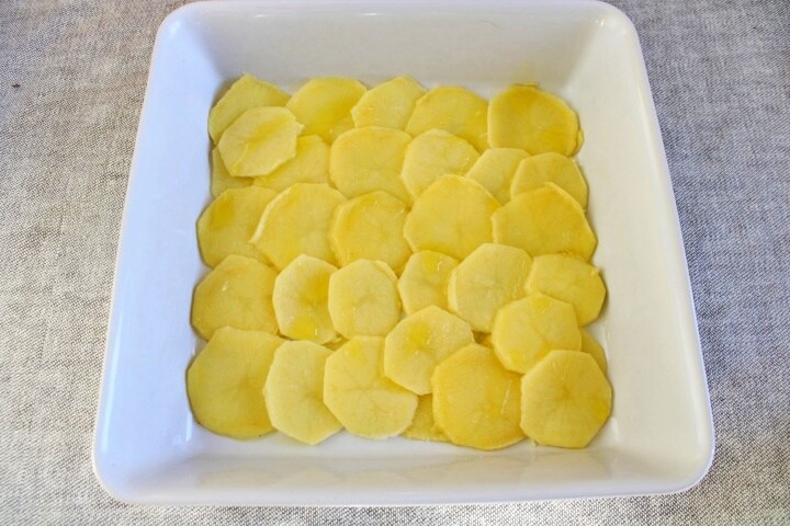 Neste ponto, descasque e lave as batatas, seque e corte em fatias redondas de cerca de 3 mm (usei o fatiador elétrico), depois descasque e pique também a cebola. Adicione uma colher de azeite em uma assadeira que possa ir à mesa. Coloque no fundo uma camada de batatas, sobrepondo levemente, salgue e regue com um fio de azeite.