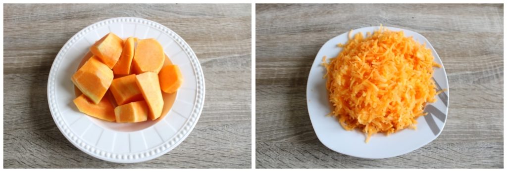 • Limpe a abóbora e rale-a usando um ralador de furos largos (ou um ralador elétrico), salgue-a e deixe-a escorrer em uma peneira por cerca de 10 minutos.