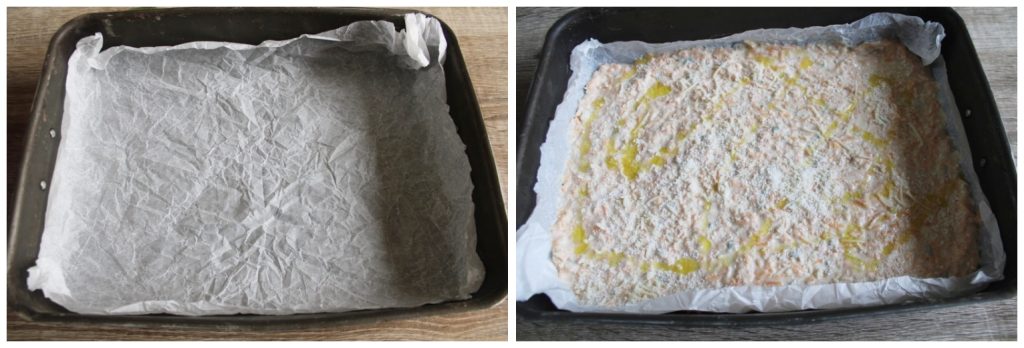 • Despeje a massa em uma assadeira retangular (28×34 cm), previamente forrada com papel manteiga e nivelar com uma espátula. Adicione um fio de azeite extravirgem e uma pitada de parmesão ralado.
