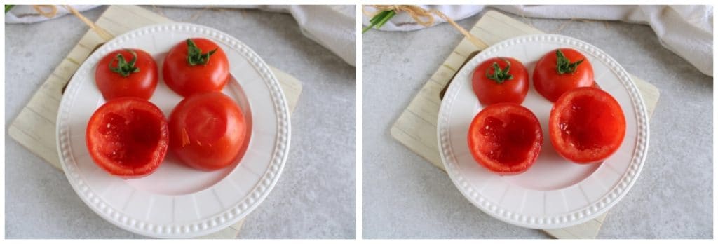 Enquanto isso, prepare os tomates: lave-os e corte a tampa superior de cada um. Corte levemente a base dos tomates, para que fiquem em pé sem tombar. Em seguida, esvazie-os completamente, usando uma colher, salgue-os levemente e coloque-os de cabeça para baixo em um prato.
