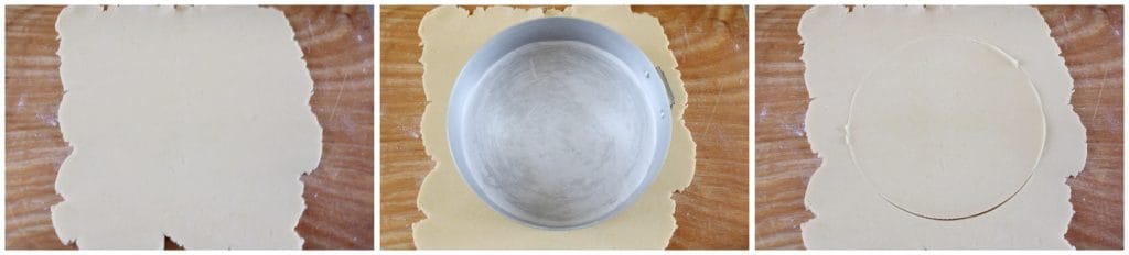 Estenda a massa sobre a superfície de trabalho ligeiramente enfarinhada, coloque sobre a forma, corte a base e coloque sobre o papel manteiga.