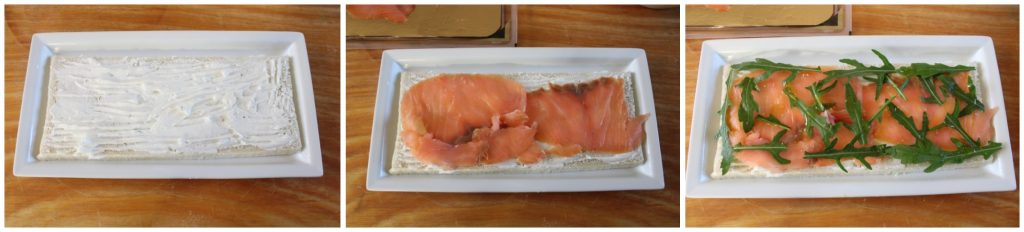 • Espalhe um pouco do creme de queijo na primeira fatia de pão; coloque o salmão de forma a cobrir toda a superfície, depois as folhas de rúcula, e tempere com um fio de azeite de oliva extravirgem e as raspas de um pouco menos da metade de um limão.