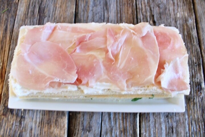• Cubra a fatia de pão com o creme de queijo, e depois com o presunto cozido, então cubra com o pão.