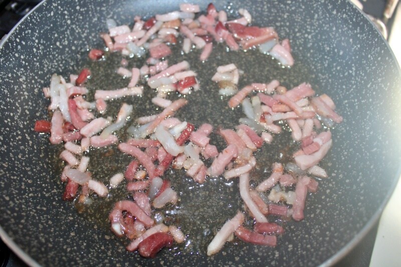 Aqueça em uma frigideira um fio de azeite de oliva extravirgem, adicione o speck e doure levemente, depois adicione também as batatas, salgue e cozinhe por cerca de 8-10 minutos, mexendo frequentemente, até que as batatas estejam amolecidas, mas ainda consistentes. O recheio continuará cozinhando no forno. Desligue o fogo e deixe esfriar um pouco.
