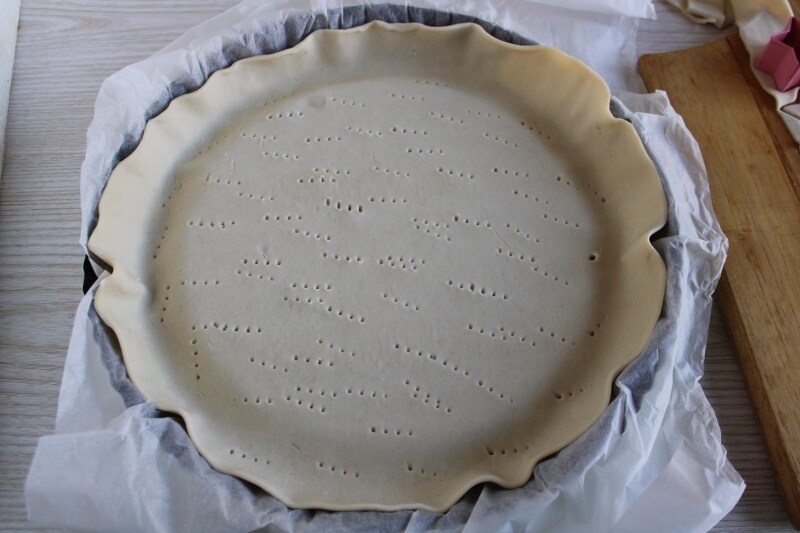 Desenrole a massa folhada e coloque-a, com seu papel manteiga, em uma forma de torta de cerca de 24-26 cm de diâmetro. Fure o fundo com os dentes de um garfo.
