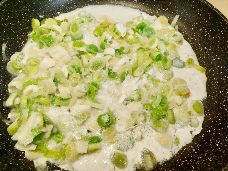 Em uma frigideira antiaderente, aqueça o azeite de oliva extravirgem, adicione o alho-poró em rodelas, e, a gosto, sal, pimenta preta e noz-moscada. Deixe por 1 – 2 minutos.