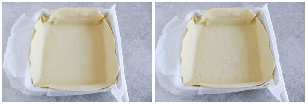 • Desenrole a massa brisée e coloque-a com o papel na assadeira. Fure o fundo com os dentes de um garfo.